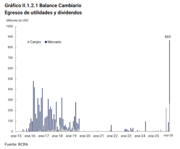 Los egresos por utilidades y dividendos del mes, detalló el informe, fueron de US$869 millones, los cuales fueron realizados mediante compras en el mercado de cambios por US$603 millones y a través de operaciones de canjes (US$265 millones), fondeados principalmente a través de cobros de BOPREAL.