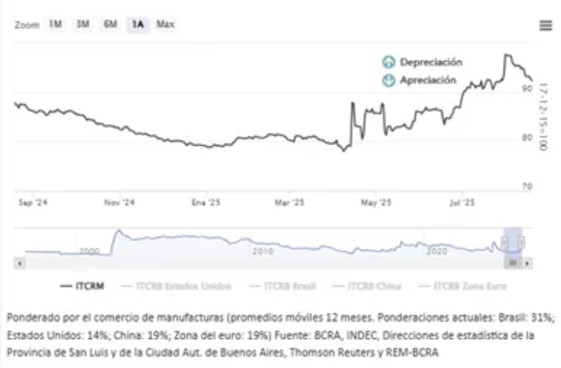 "A pesar de que el tipo de cambio se alejó del techo la banda estas últimas semanas, todavía estamos por debajo de niveles muy altos de competitividad. El FMI, en el reporte de abril sugirió que el TCRM tenía que estar en un 15% a 25% arriba de lo que era el primer trimestre de 2025, es decir, entre 93 y 100. Hoy estamos en 92, con lo cual estamos dentro de un rango aceptable, pero todavía no estamos en rangos muy altos de competitividad", sostuvo Bagilet.